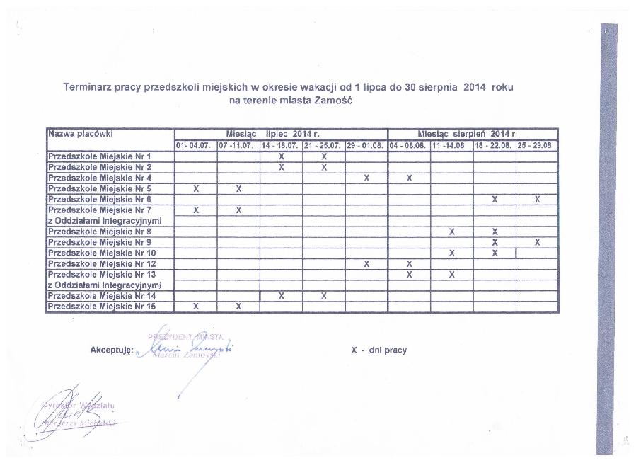 TERMINARZ PRACY PRZEDSZKOLI MIEJSKICH W OKRESIE WAKACJI OD 1 LIPCA DO 30 SIERPNIA 2014 ROKU NA TERENIE MIASTA ZAMOŚĆ