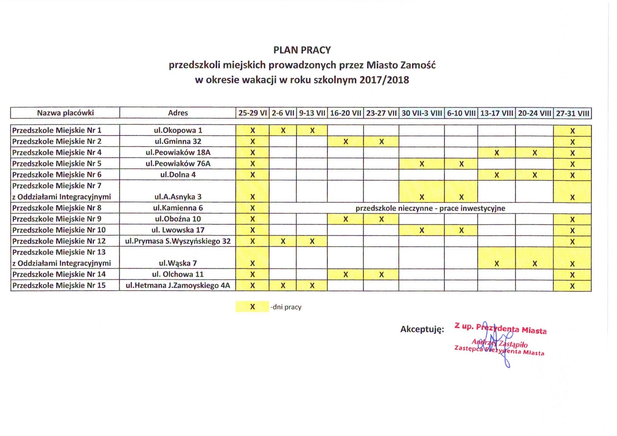Plan pracy przedszkoli miejskich prowadzonych przez Miasto Zamość w okresie wakacji w roku szkolnym 2O17/2O18